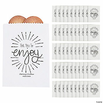β’ Personalize It!: Personalized packaging adds unforgettable style to your event and makes your guests feel festive and appreciated.β’ Say Thanks with Sweets: Are you looking for an easy way to thank the people in your life? These multipurpose bags filled with dainty bonbons, cookies, and mints are sure to delight the eyes as well as the palate.β’ Wonderful for Weddings: These charming gift bags blend perfectly with any wedding decor theme or color scheme.Product Description:Event goodie bags for all your toothsome treats! Use them to present candy and cookies to your guests, or pile them on the candy buffet or popcorn bar for your folks to help themselves. These treat bags blend seamlessly with any decor theme. Personalized wedding supplies make your special day even more fantastic. Personalize with 2 lines of text. Size: 5 3/4″ x 7 3/4″Quantity: 50Material: PaperΒ© OTC