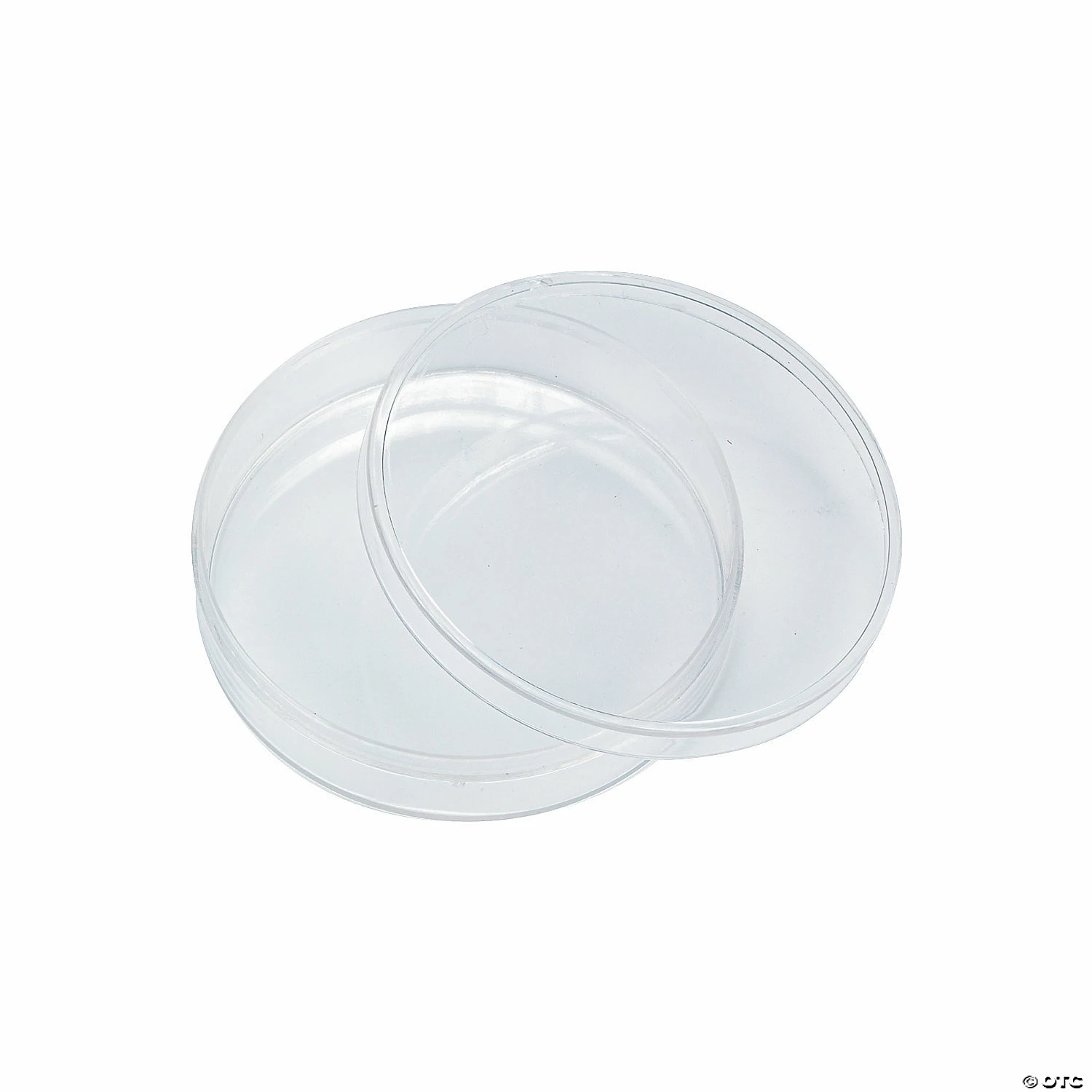 Clear Round Containers. Keep things organized and ready to go! Clear Round Containers are perfect for keeping materials for crafts easily accessible. Plastic. (2 dozen per unit) 2 3/4″ x 2 3/4″ x 3/4″