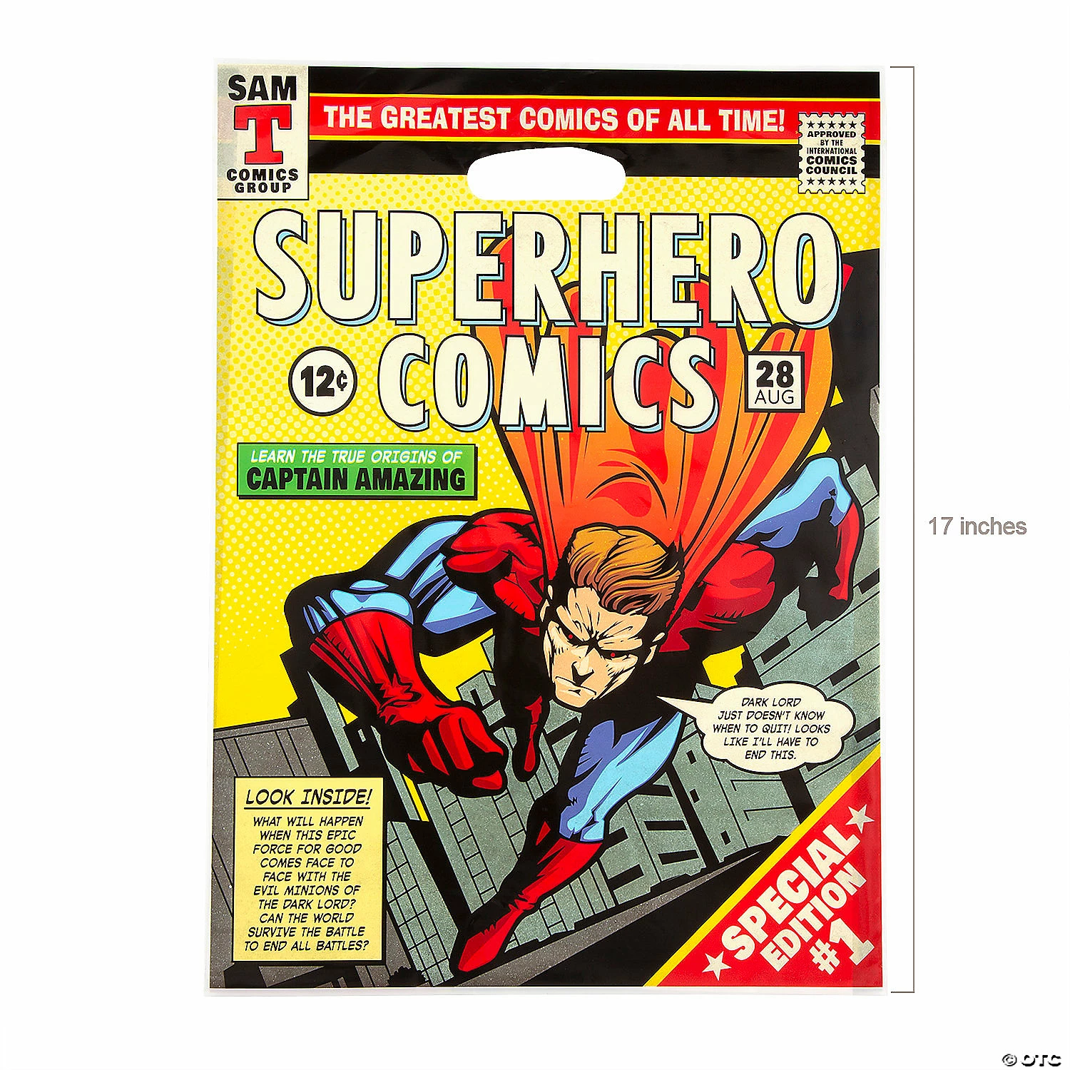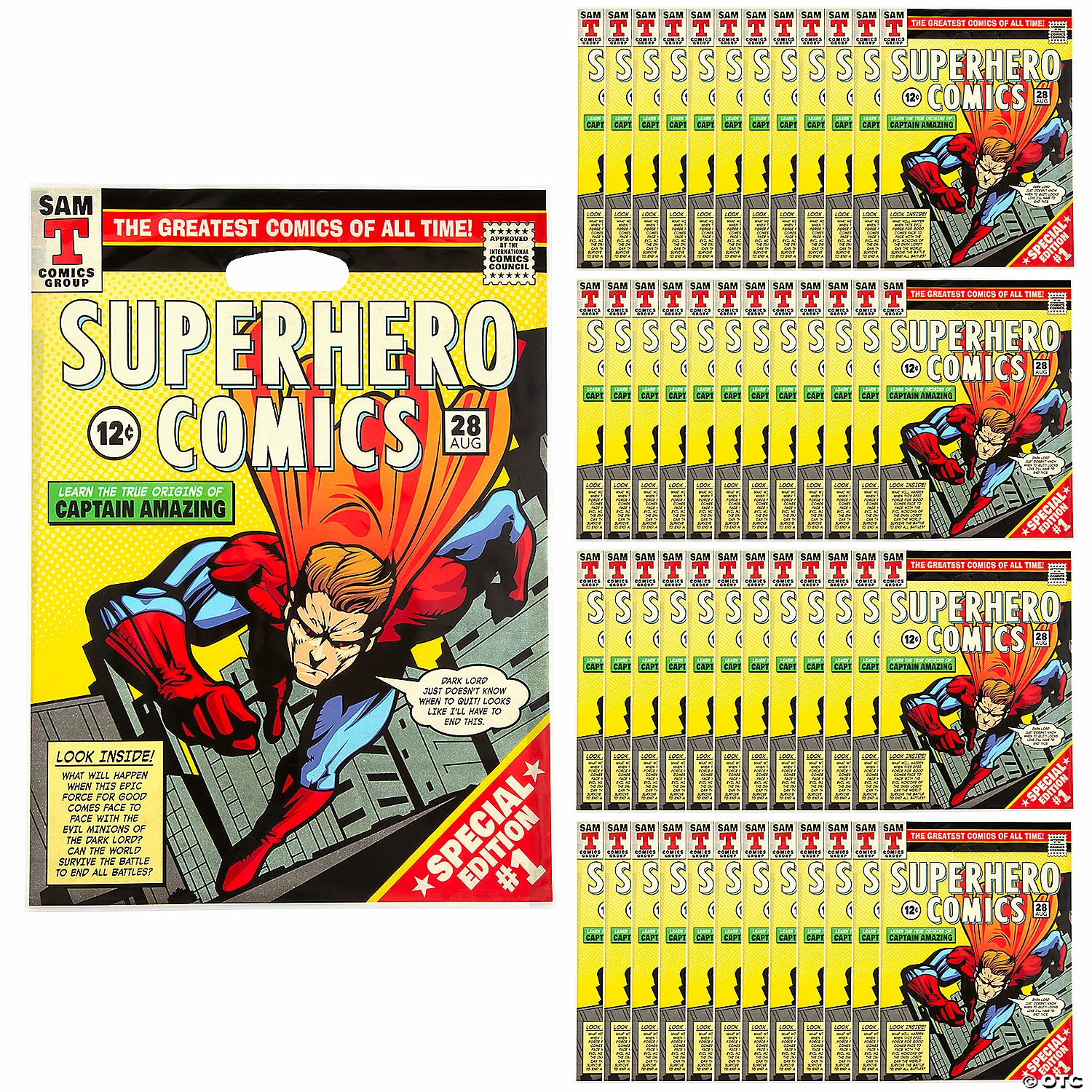 β’ Perfect Size for Parties: These treat bags are just the right size for candies. Fill them up with tasty treats and hand them out as party favors at your next birthday party, holiday gathering or wedding reception!β’ Sweet Style: Display your delicious delights or party favors in style with these fun bags! You can make a decorative statement at any event with these bags, a few treats and some stylish twist ties.β’ Say Thanks with Sweets: Are you looking for an easy way to thank the people in your life? These multipurpose bags filled with great snacks are a sweet way to spread appreciation among party guests, students and teachers, or employees!Product Description:Itβs a bird, itβs a planeβ¦no, itβs a super birthday with this find! A must-have for party supplies, these goody bags are made to look like the cover of an action-packed comic book. Fill with tiny kidsβ toys or tasty treats and watch as all your little guests soar here, there, everywhere with excitement. No super capes needed! Size: 12 1/2″ x 17″Quantity: 50Material: Plastic.