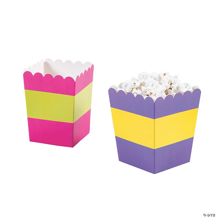 Dig in and delight when you serve up some treats at your next birthday party with these popcorn boxes! Great for birthday party party supplies, these popcorn boxes come in bright hues of pink and purple, each featuring a bold yellow stripe. Place near your popcorn popper or on your serving table with your other disposable tableware for easy access and a quick post-party cleanup. You could even grab some personalized stickers to attach to these boxes for a more personal touch. Paper. 3″ x 3″ x 4″ Simple assembly required. ยฉ OTC